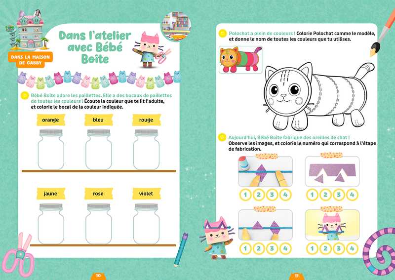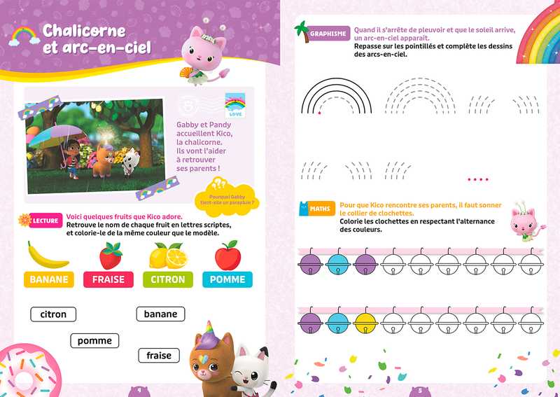 - Des doubles pages spéciales pour explorer le monde en compagnie d’un Gabby Chat dans la maison magique.