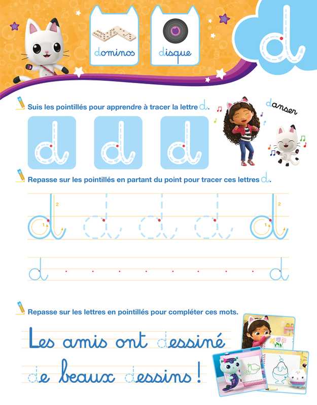 - deux tailles de lignes d’écriture pour s’entraîner à écrire la lettre et préciser son geste, avec des modèles pour droitiers et gauchers ;