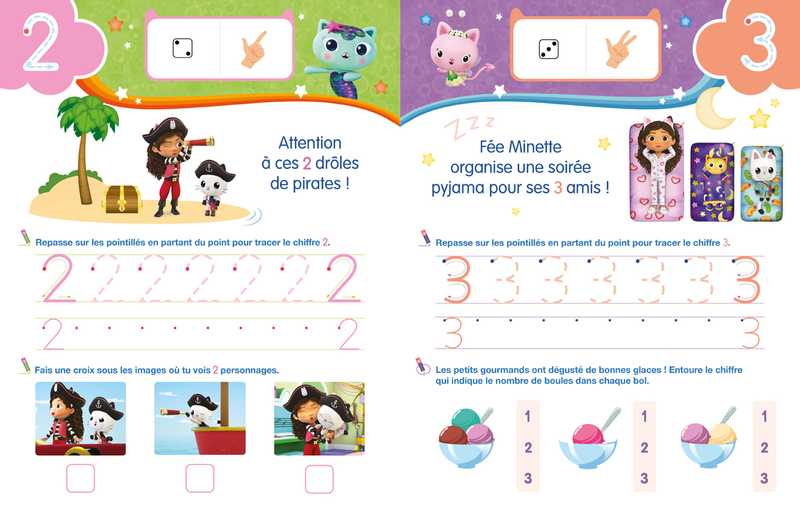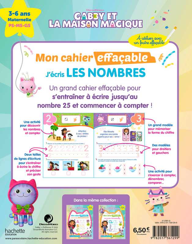 - deux tailles de lignes d’écriture pour s’entraîner à écrire les nombres et préciser son geste, avec des modèles pour droitiers et gauchers ;