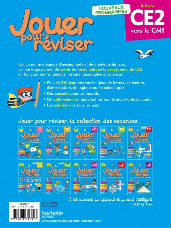 Conçu par une équipe d’enseignants et de créateurs de jeux, cet ouvrage permet de revoir de façon ludique le programme du CE2 en français, maths, histoire, géographie et sciences.