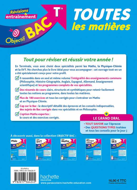 Il rassemble dans un seul et même volume l’intégralité des enseignements communs (Philosophie, Histoire-Géographie, Anglais, Espagnol, Allemand, Enseignement scientifique) et les programmes complets de vos spécialités.