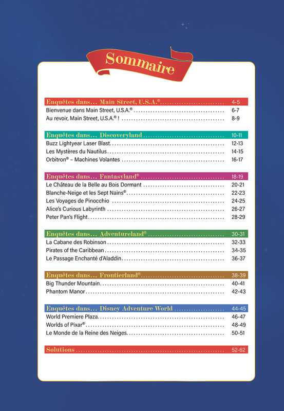 • 18 grandes enquêtes au cœur des attractions les plus emblématiques des Parcs Disney, avec des énigmes, des jeux et des casse-têtes ;