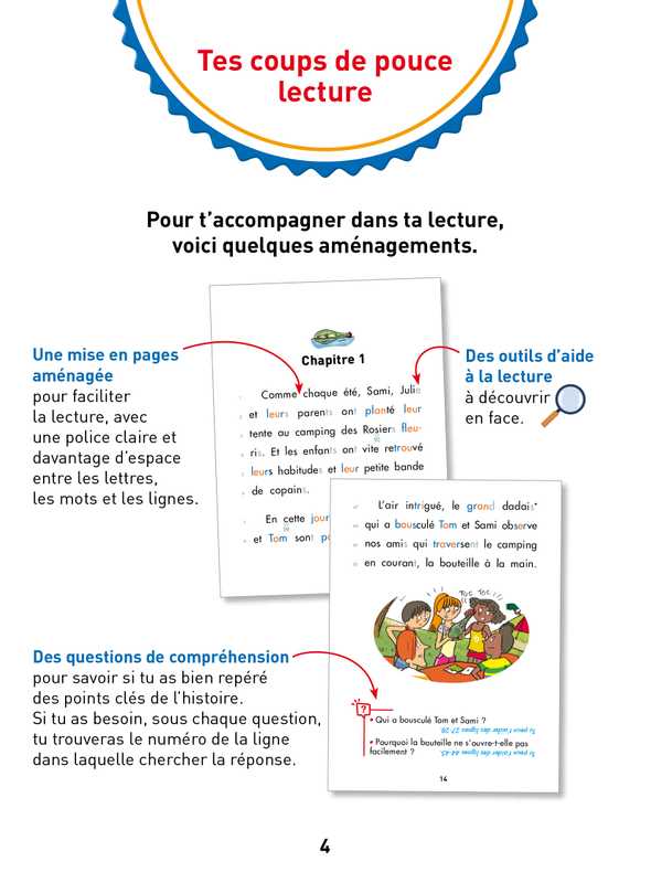 Élaborée par des orthophonistes, cette collection propose deux niveaux progressifs, avec des aménagements différents selon la fluidité de lecture  :