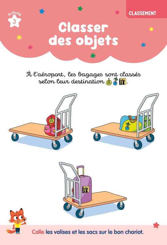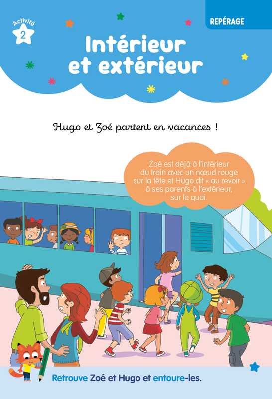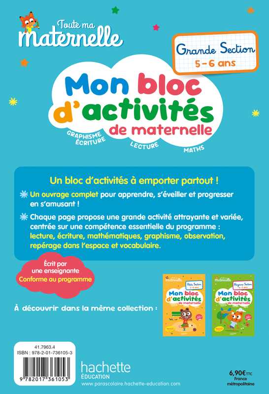 - Chaque page propose une grande activité attrayante et variée, centrée sur une compétence essentielle du programme : lecture, écriture, mathématiques, graphisme, observation, repérage dans l’espace et vocabulaire.