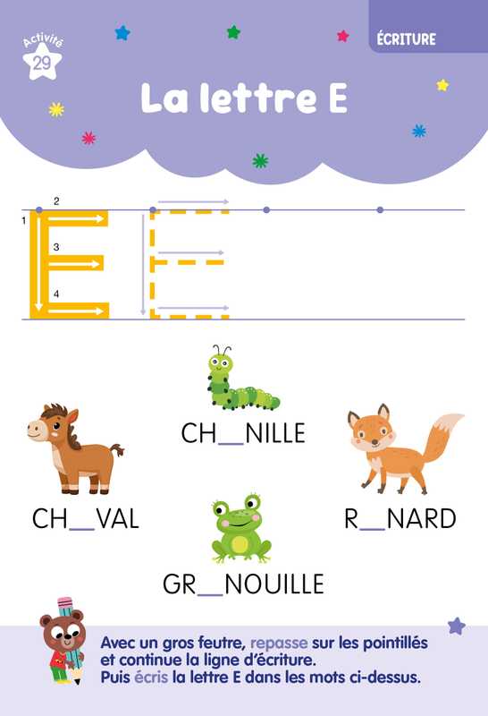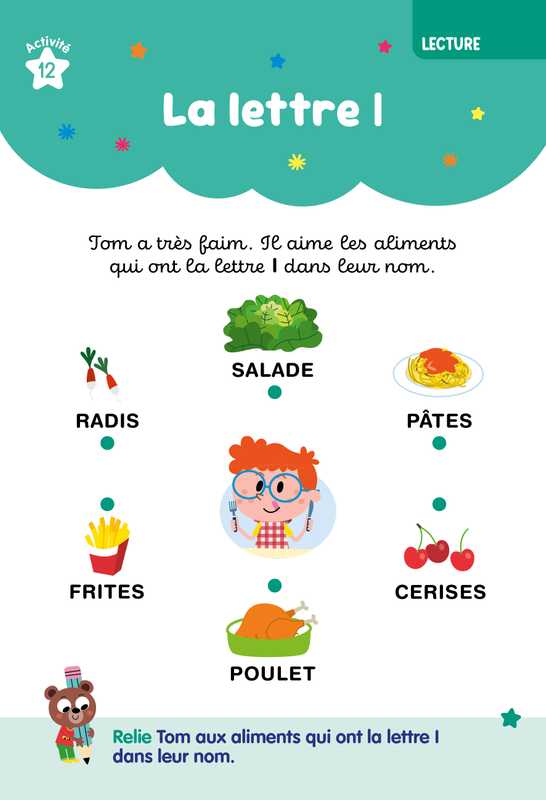 - Chaque page propose une grande activité attrayante et variée, centrée sur une compétence essentielle du programme : lecture, écriture, mathématiques, graphisme, observation, repérage dans l’espace et vocabulaire.