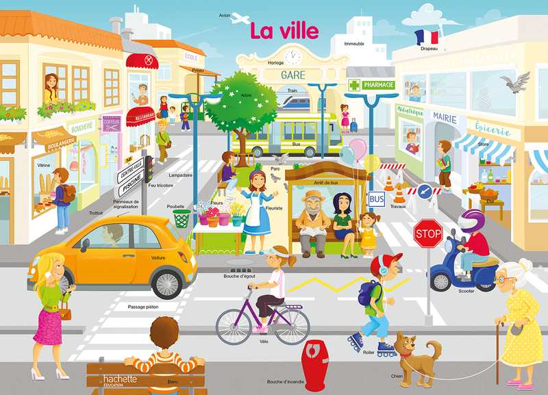 - Un poster à détacher et à afficher : au recto, l’alphabet ; au verso, le vocabulaire de la ville joliment illustré.